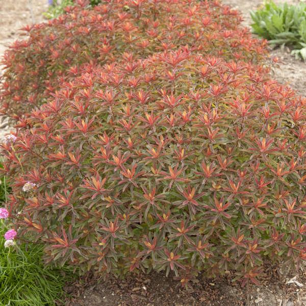 One of the best landscape plants for all-season color. ‘Bonfire’ PP18585 is one of the most colorful spurges ever invented! The top growth is a fantastic combination of deep purple, red, and orange leaves with a touch of chartreuse, while the undergrowth is green. The foliage tends to deepen to burgundy red at the height of summer. Turns rich red in the fall.
