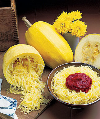Medium-sized, 3-4 lb. oblong fruits. The fruit’s interior is ready for serving like spaghetti. Can be stored several months. Lowest carbs of all the winter squash, use as a noodle substitute.